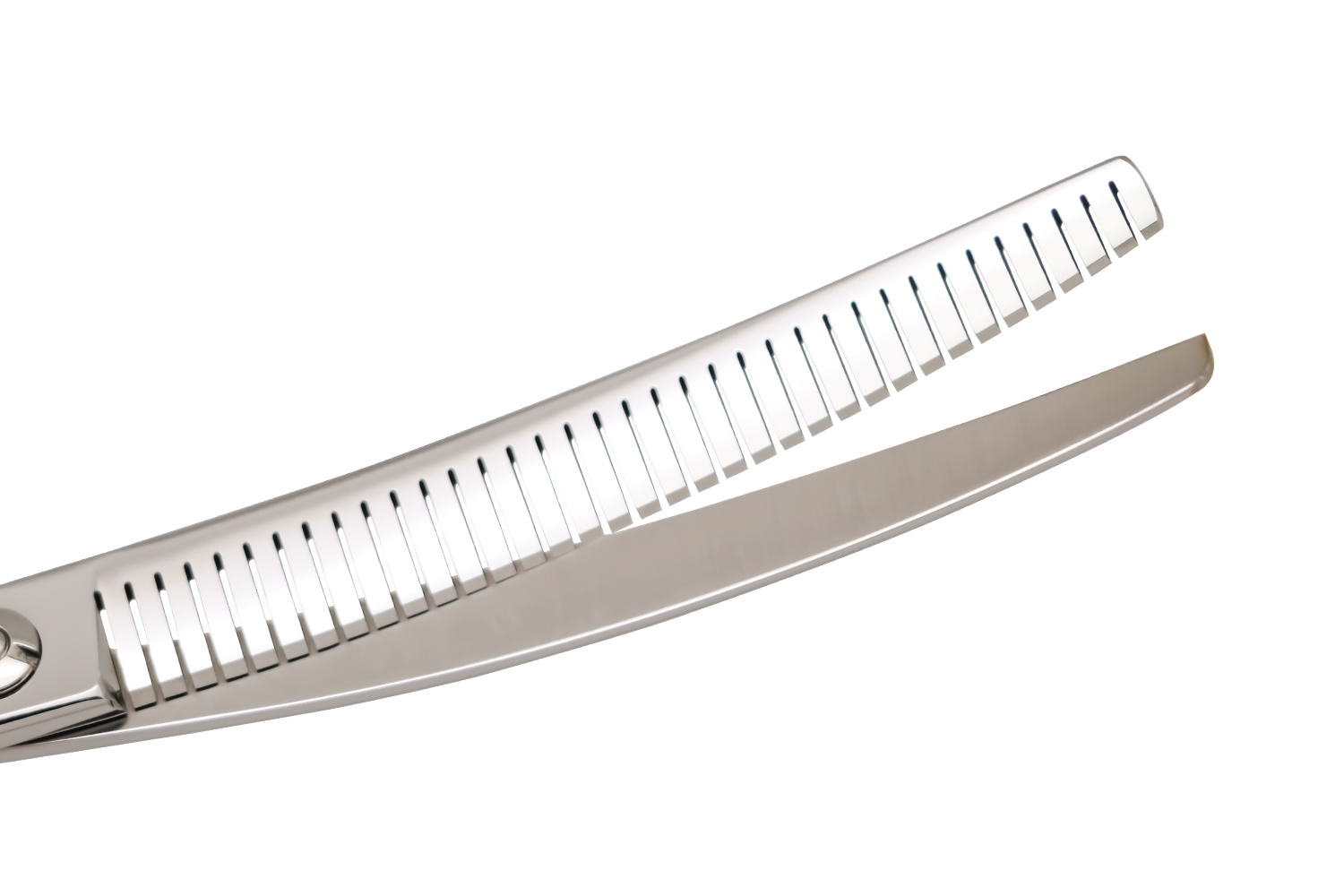 Κατασκευασμένο από premium ιαπωνικό ατσάλι JP440C με καμπυλότητα 30°. Ελαφρύ (65.5 g) και ισορροπημένο για finishing, soft blending και retouching. Η fluffy λειτουργία του γυαλίζει την τρίχα και της δίνει φυσικό όγκο χωρίς γραμμές ή βαθουλώματα. Εργονομική offset λαβή και διπλός finger rest προσφέρουν άνεση και ακρίβεια στην κίνηση. Το mirror polished finish εξασφαλίζει ομαλή κοπή και μειωμένη τριβή, ενώ η ρυθμιζόμενη βίδα Pupelle κρατά σταθερή ευθυγράμμιση. Ιδανικό για μαλακό, νεανικό και ίσιο τρίχωμα, αποδίδει όμως εξαιρετικά και σε πιο πυκνές υφές με σωστή τεχνική. Ένα ψαλίδι-κόσμημα που δίνει ζωντάνια και λάμψη σε κάθε πέρασμα.